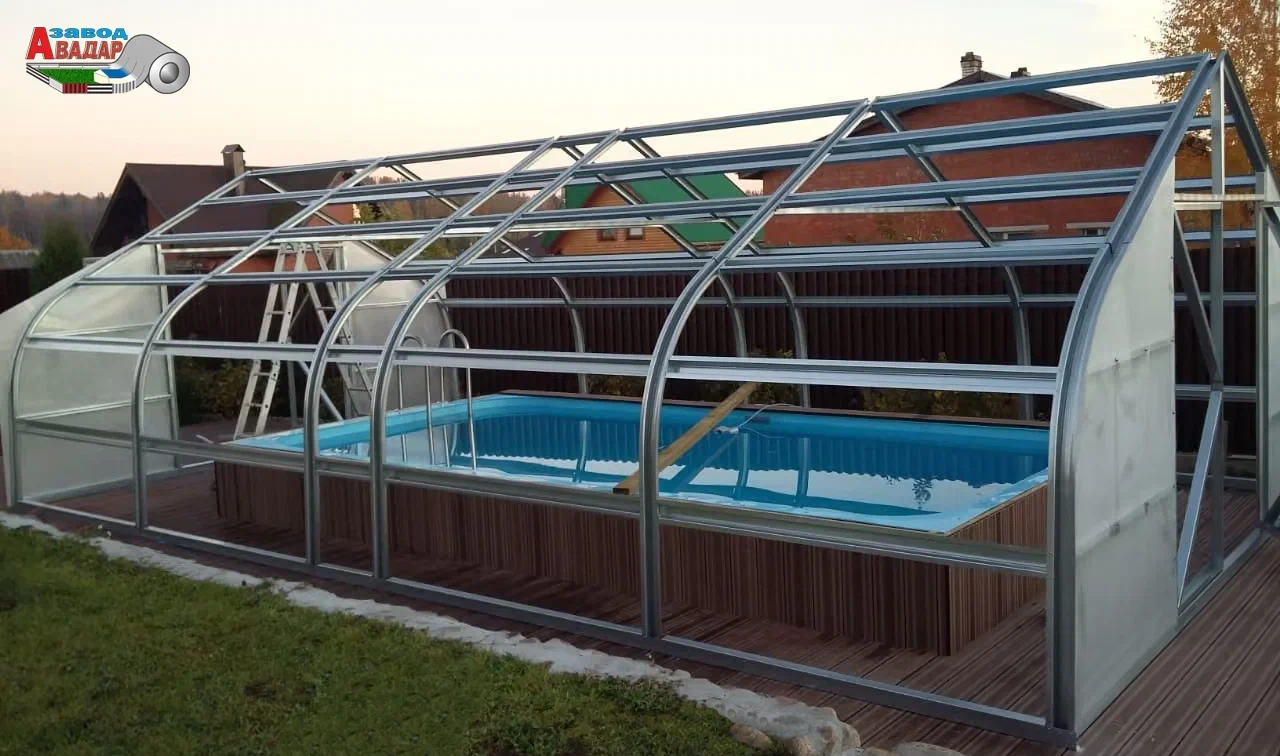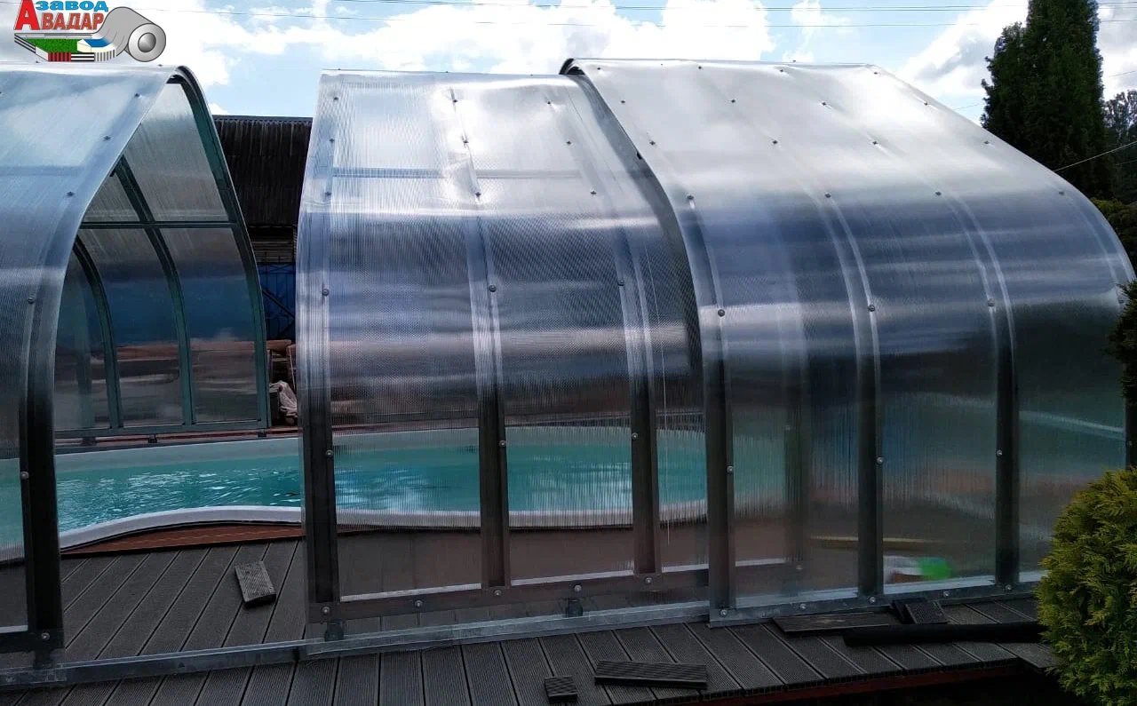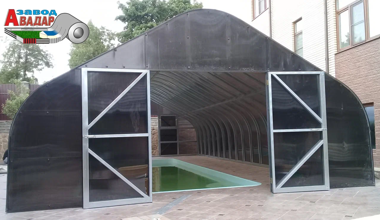 ПАВИЛЬОНЫ БАССЕЙНОВ из поликарбоната Раздвижные Укрытия Рельсы из М-профиля ПЛАТФОРМЫ откатные над БАССЕЙНОМ из ЛСТК NEW! Крытый бассейн для дачи вы можете собрать своими руками — 100% монтаж каркасов без сварочных работ. Павильоны для бассейна из поликарбоната черного цвета имеют низкую теплопроводность, защищают от солнечного света и сохраняют естественную цветопередачу внутри навеса для бассейнов