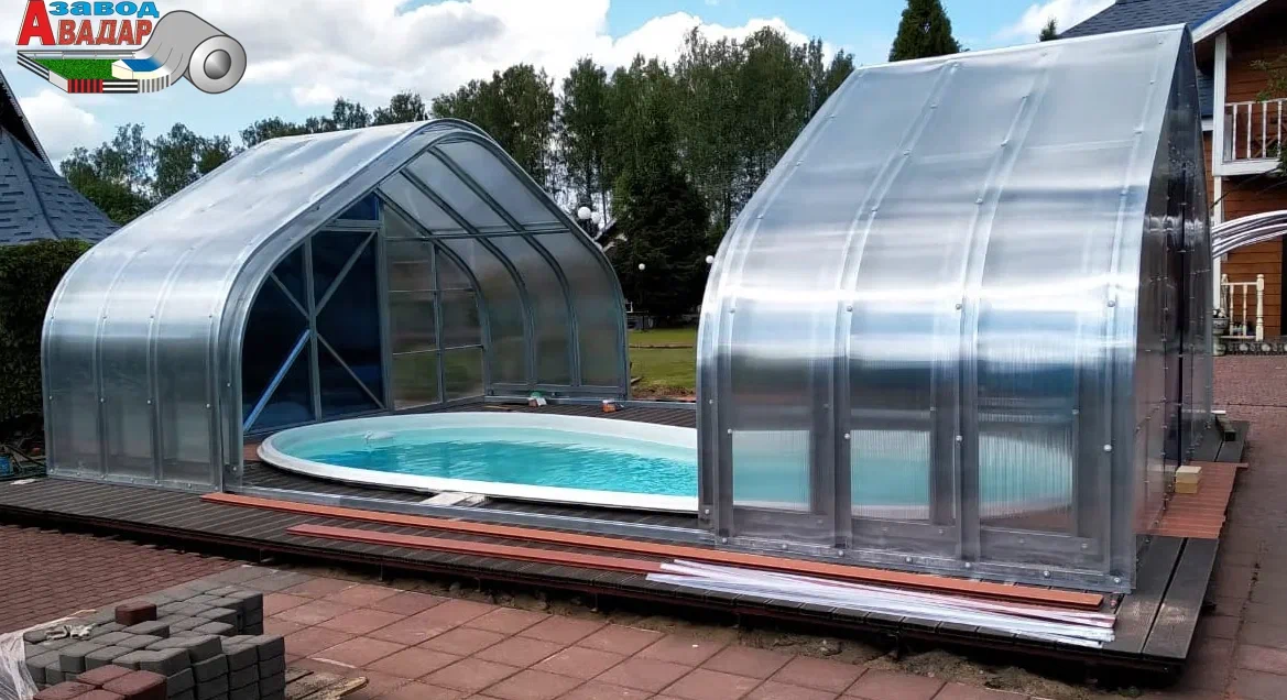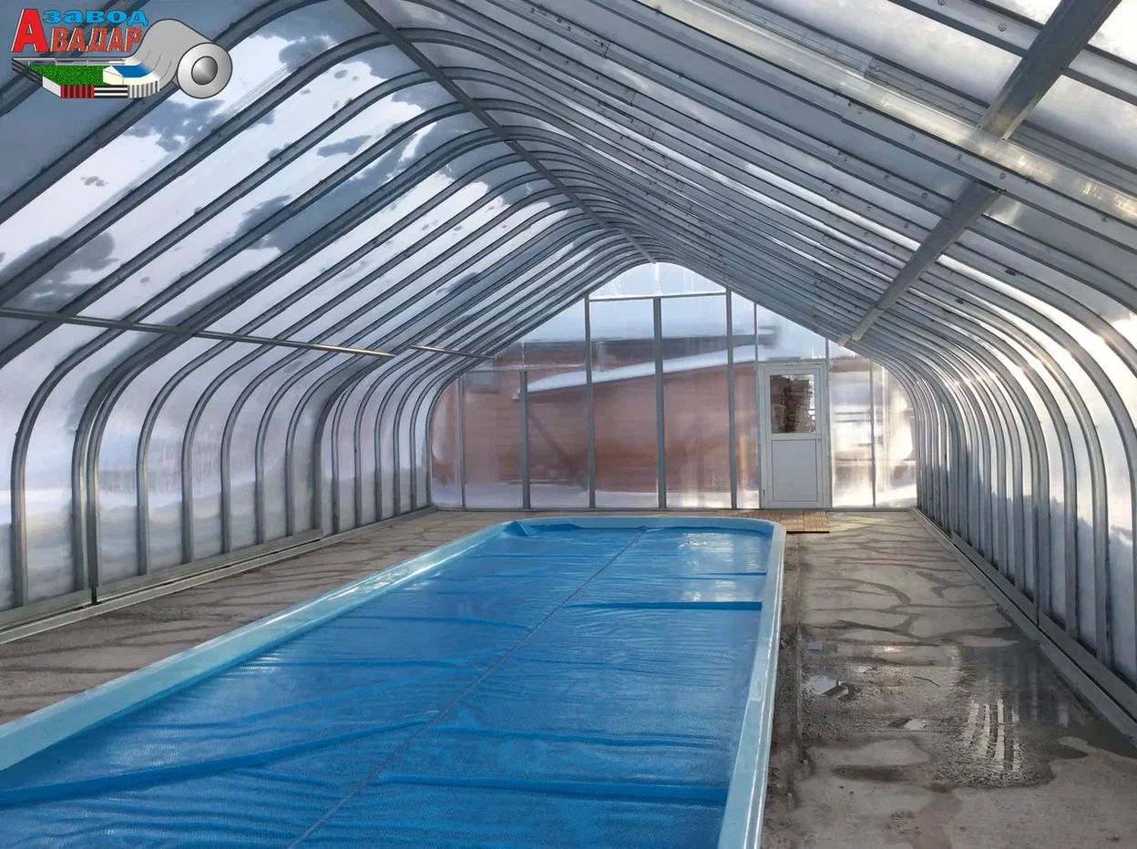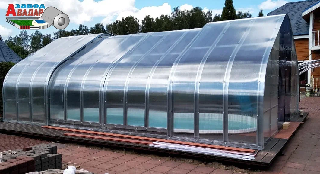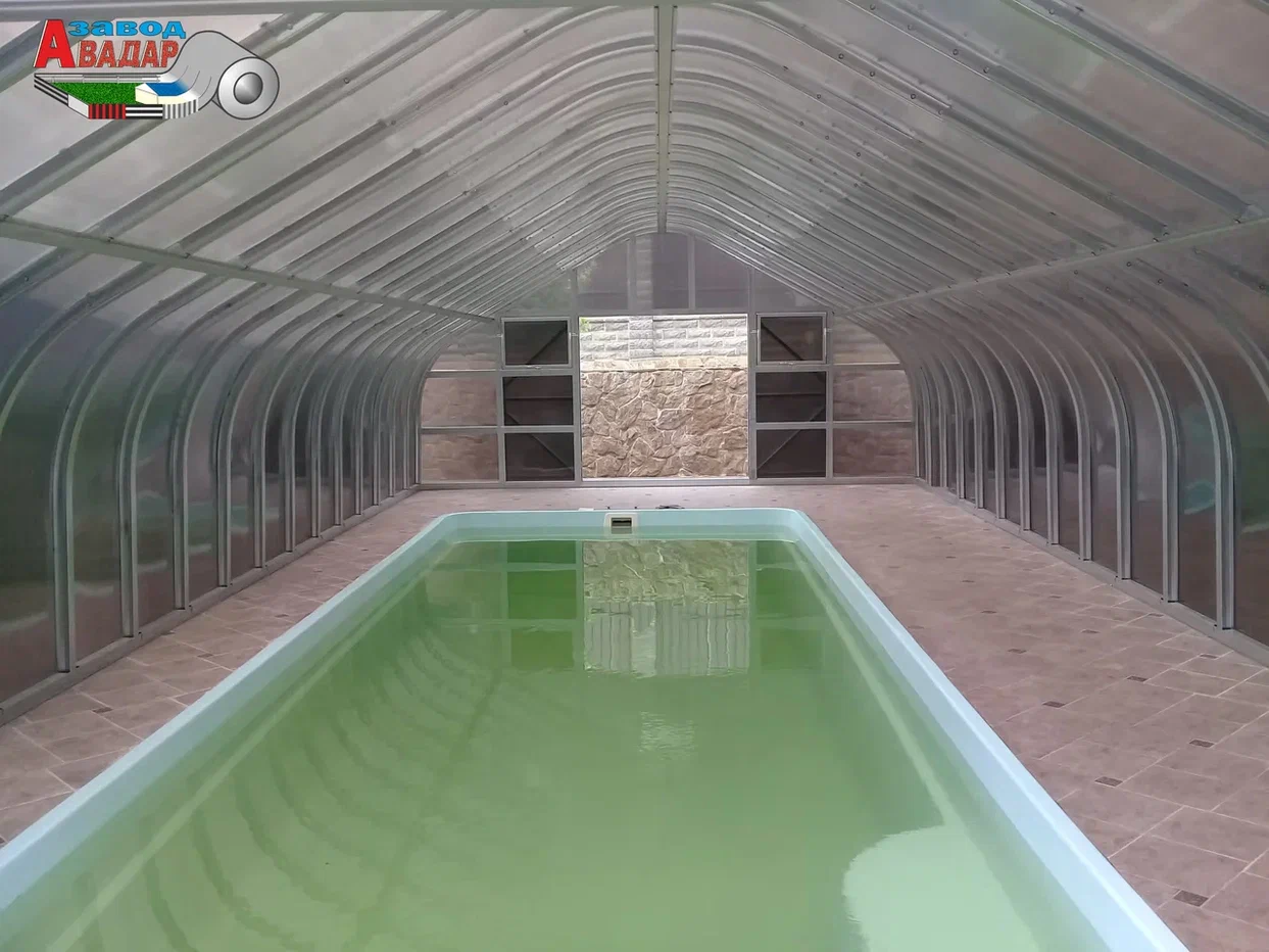 ПАВИЛЬОНЫ БАССЕЙНОВ из поликарбоната Раздвижные Укрытия Рельсы из М-профиля ПЛАТФОРМЫ откатные над БАССЕЙНОМ из ЛСТК NEW! Крытый бассейн для дачи вы можете собрать своими руками — 100% монтаж каркасов без сварочных работ. Павильоны для бассейна из поликарбоната черного цвета имеют низкую теплопроводность, защищают от солнечного света и сохраняют естественную цветопередачу внутри навеса для бассейнов